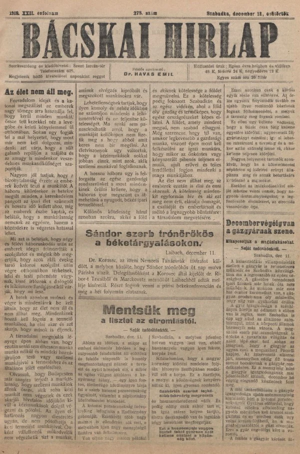 Bácskai Hirlap, 22. évf. 1918. december 12. 278. sz.