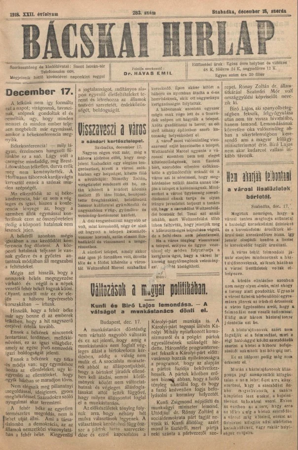 Bácskai Hirlap, 22. évf. 1918. december 18. 283. sz.