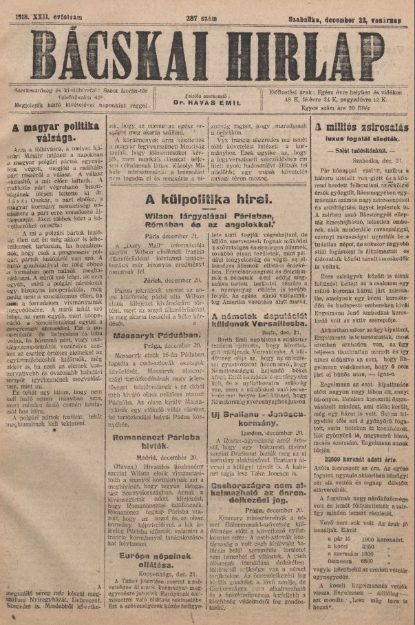 Bácskai Hirlap, 22. évf. 1918. december 22. 287. sz.