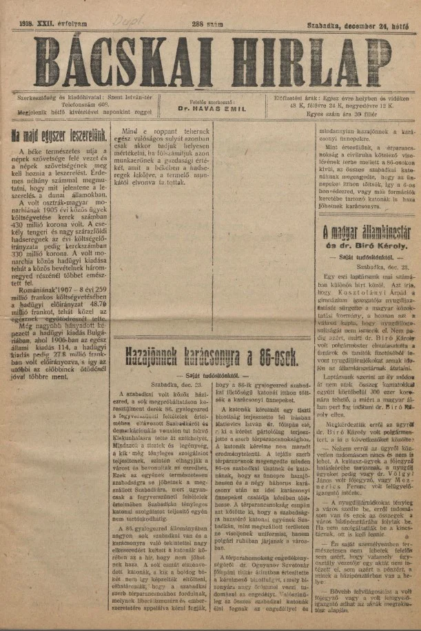 Bácskai Hirlap, 22. évf. 1918. december 24. 288. sz.