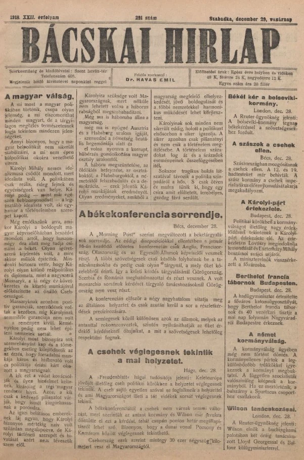 Bácskai Hirlap, 22. évf. 1918. december 29. 291. sz.
