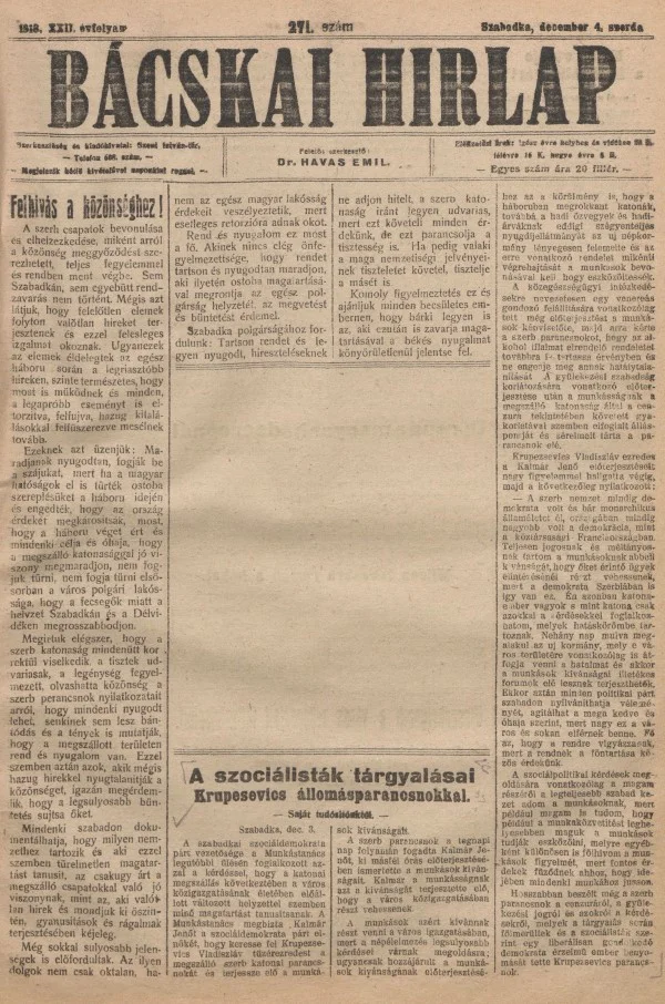 Bácskai Hirlap, 22. évf. 1918. december 4. 271. sz.