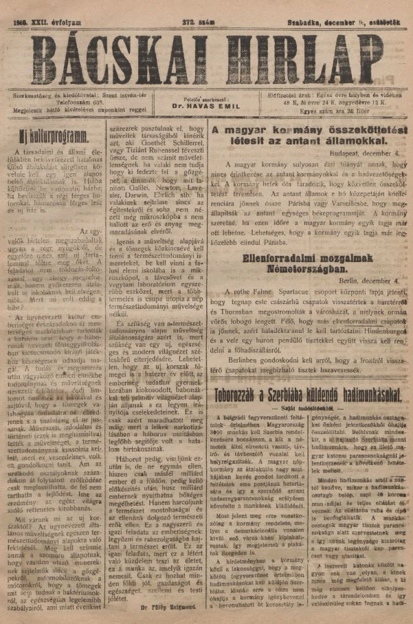 Bácskai Hirlap, 22. évf. 1918. december 5. 272. sz.