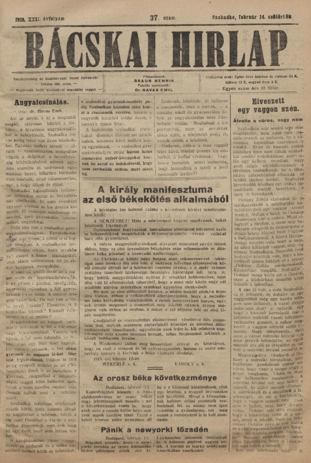 Bácskai Hirlap, 22. évf. 1918. február 14. 37. sz.