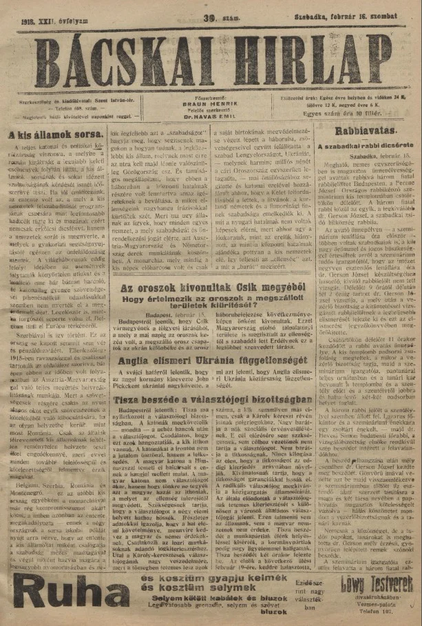 Bácskai Hirlap, 22. évf. 1918. február 16. 39. sz.