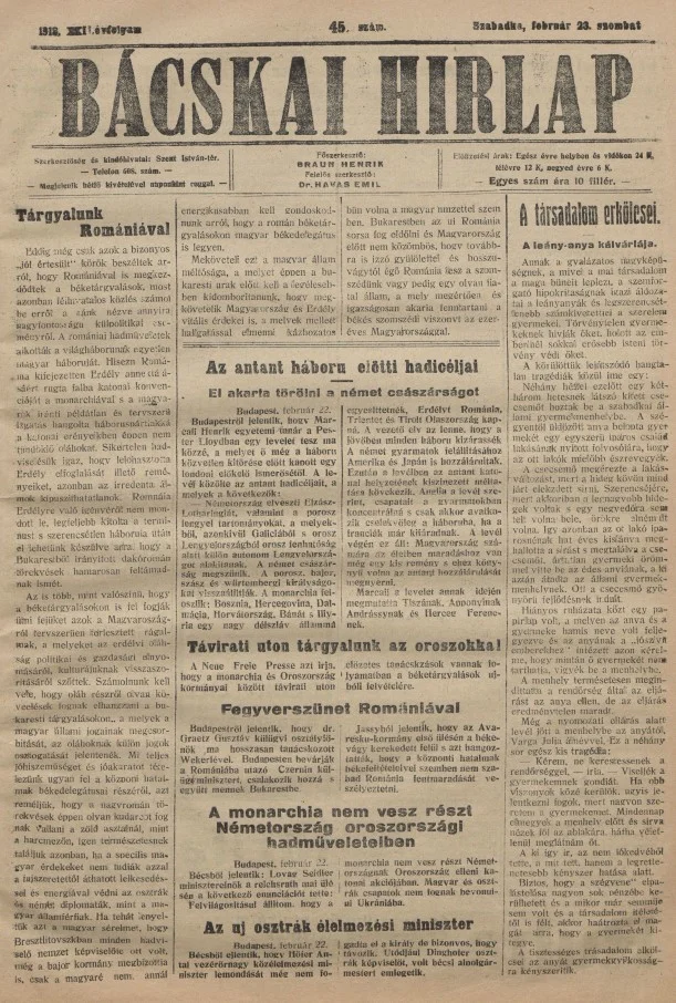 Bácskai Hirlap, 22. évf. 1918. február 23. 45. sz.