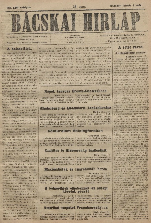 Bácskai Hirlap, 22. évf. 1918. február 5. 29. sz.