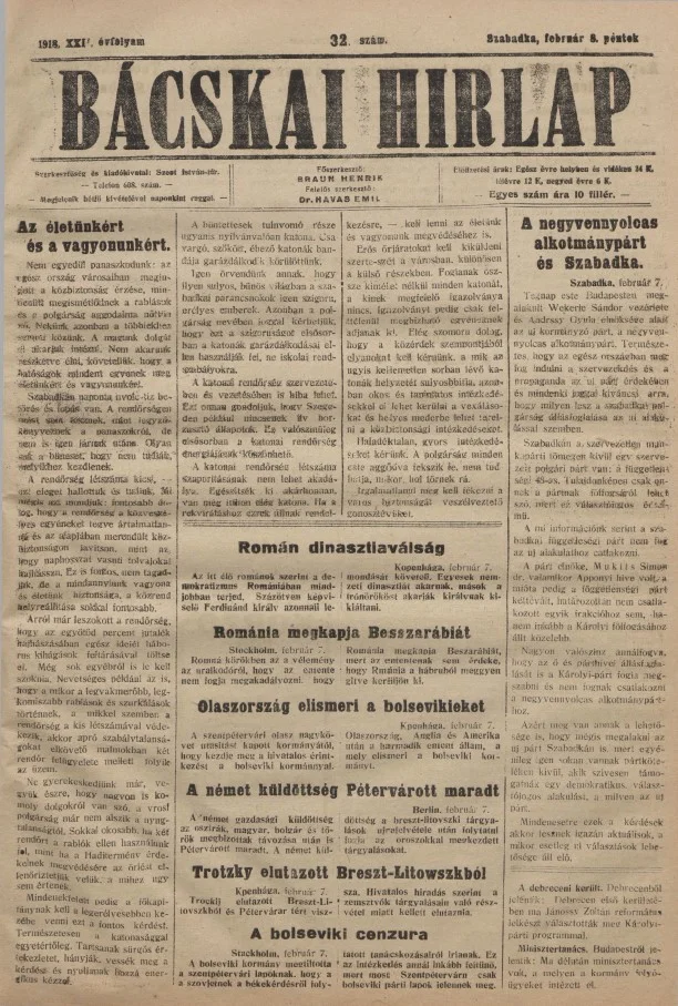 Bácskai Hirlap, 22. évf. 1918. február 8. 32. sz.
