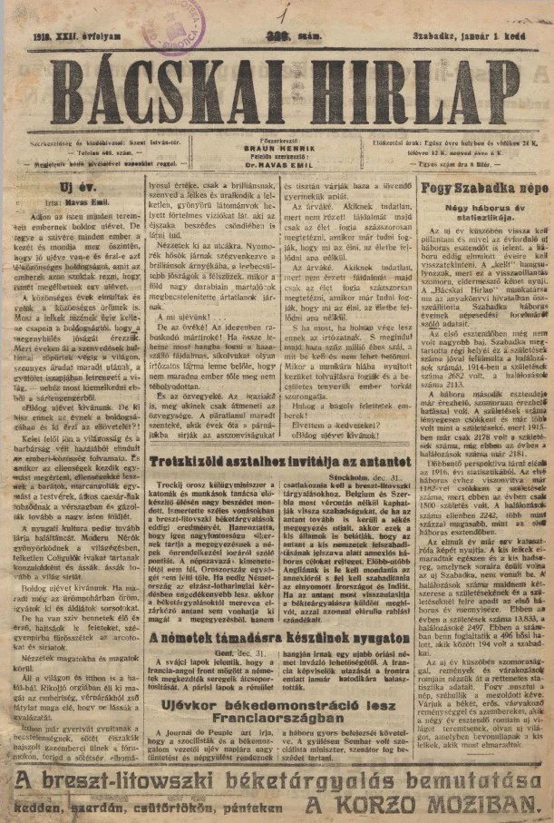 Bácskai Hirlap, 22. évf. 1918. január 1. 1. sz.