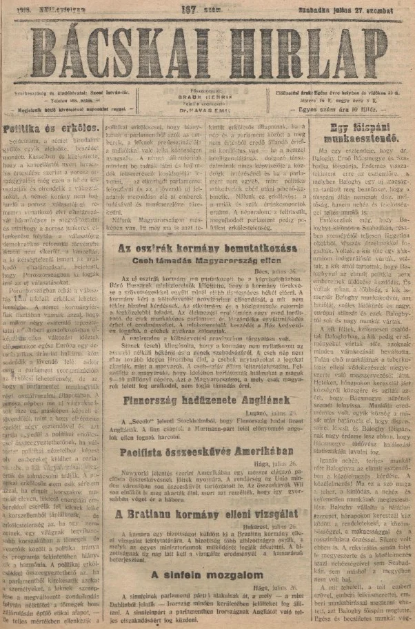 Bácskai Hirlap, 22. évf. 1918. július 27. 167. sz.