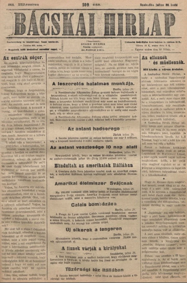 Bácskai Hirlap, 22. évf. 1918. július 30. 169. sz.