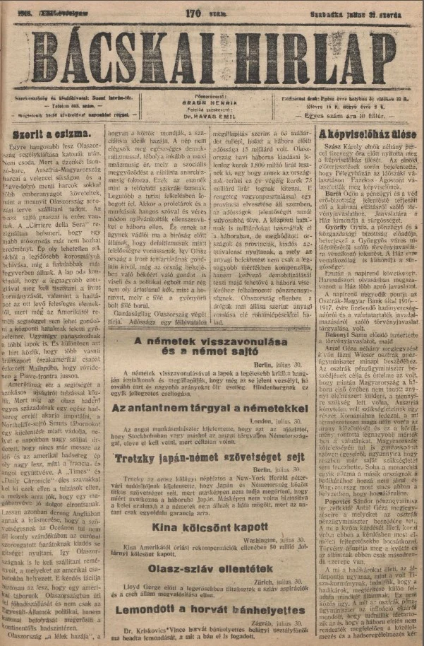 Bácskai Hirlap, 22. évf. 1918. július 31. 170. sz.
