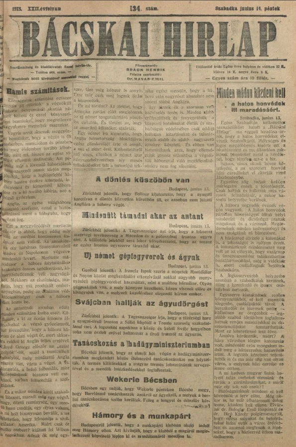 Bácskai Hirlap, 22. évf. 1918. június 14. 134. sz.