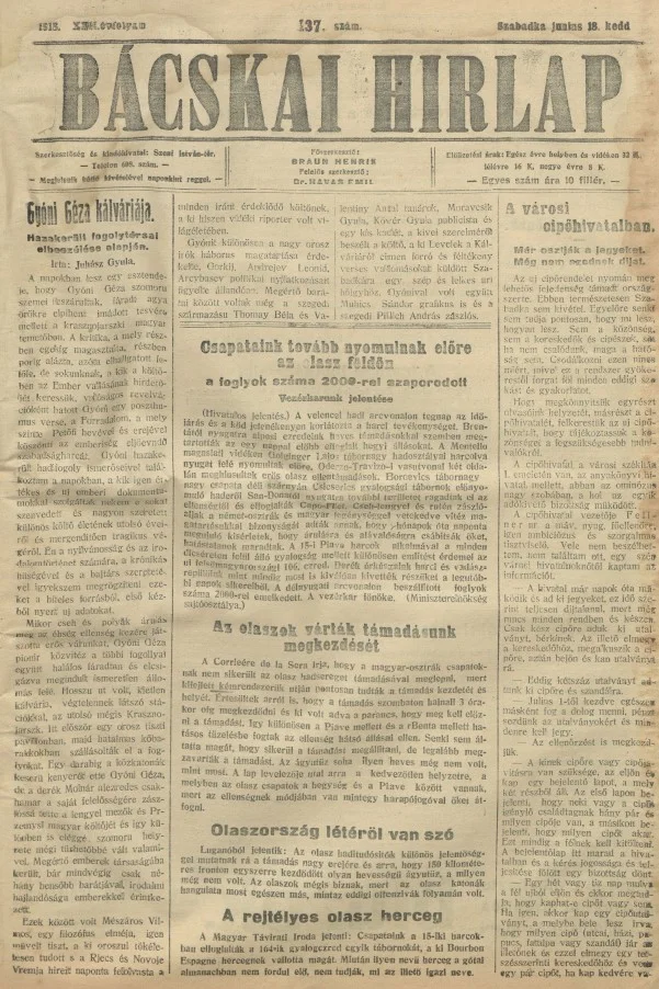 Bácskai Hirlap, 22. évf. 1918. június 18. 137. sz.