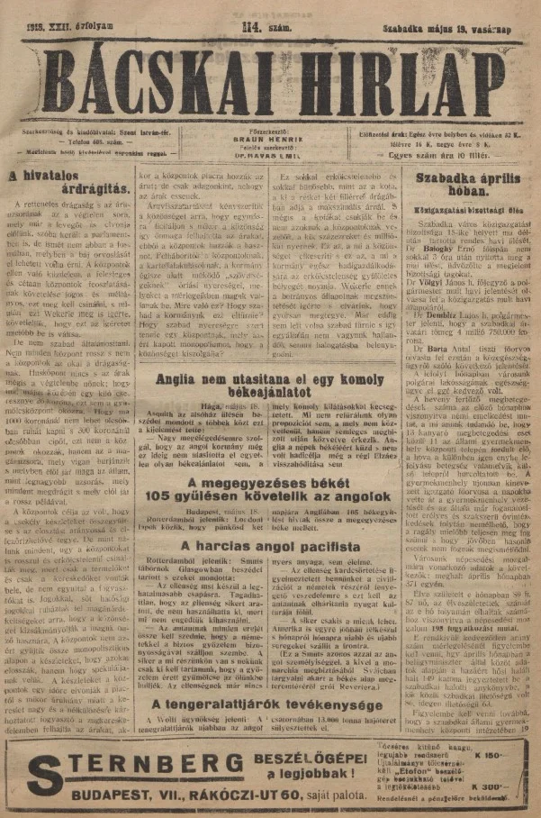 Bácskai Hirlap, 22. évf. 1918. május 19. 114. sz.