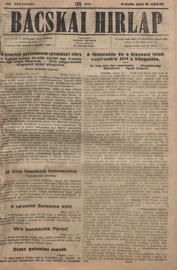 Bácskai Hirlap, 22. évf. 1918. május 30. 122. sz.