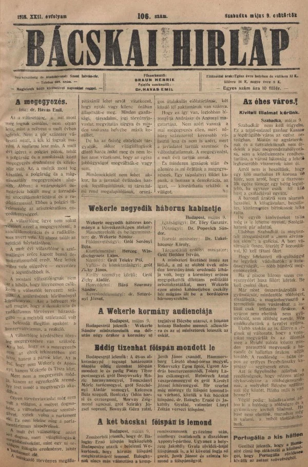 Bácskai Hirlap, 22. évf. 1918. május 9. 106. sz.