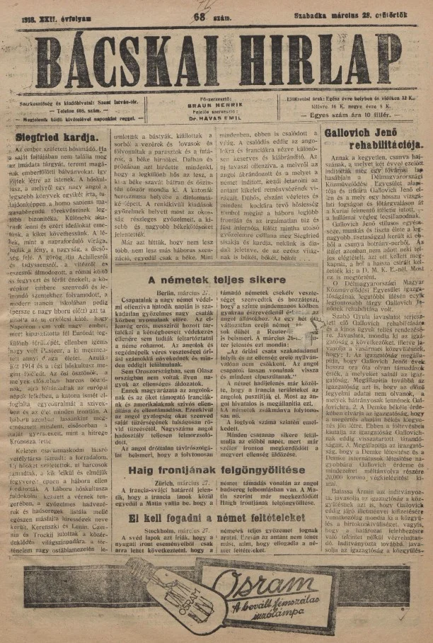 Bácskai Hirlap, 22. évf. 1918. március 28. 72. sz.