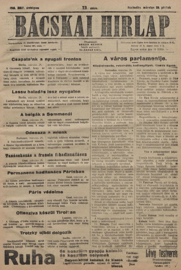 Bácskai Hirlap, 22. évf. 1918. március 29. 73. sz.
