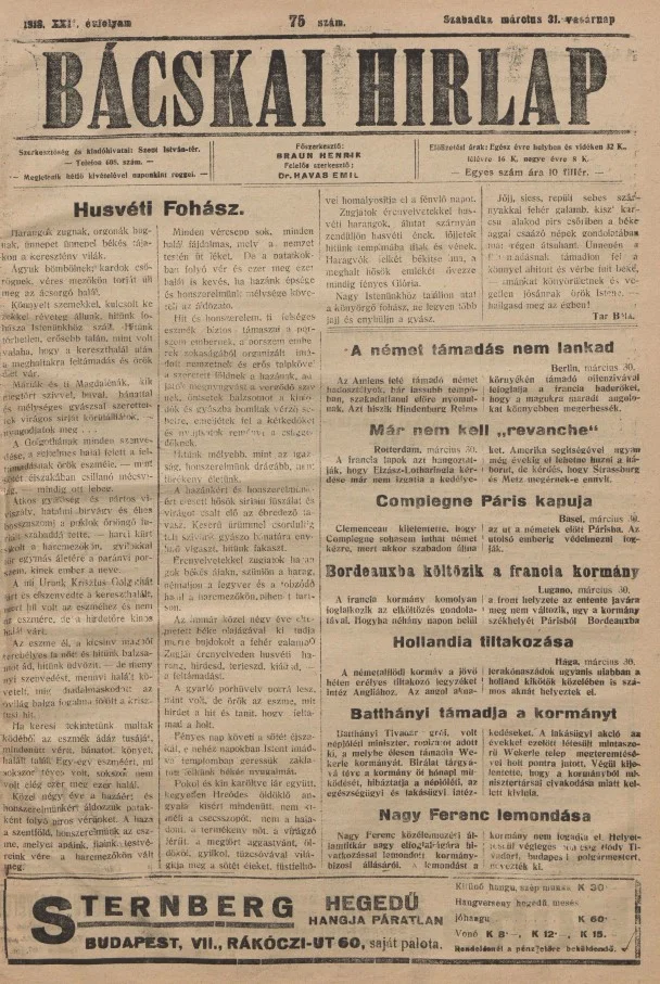 Bácskai Hirlap, 22. évf. 1918. március 31. 75. sz.