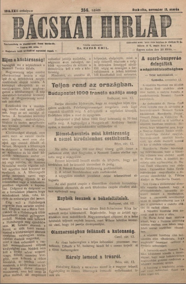 Bácskai Hirlap, 22. évf. 1918. november 13. 256. sz.
