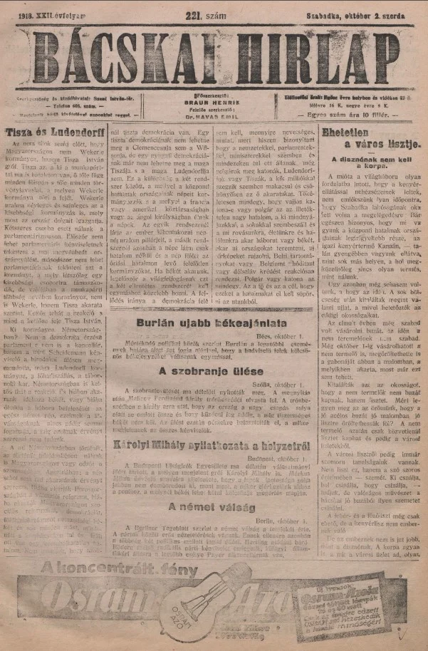 Bácskai Hirlap, 22. évf. 1918. október 2. 221. sz.