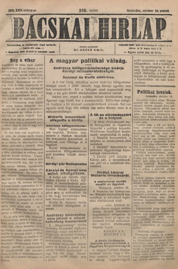 Bácskai Hirlap, 22. évf. 1918. október 25. 240. sz.