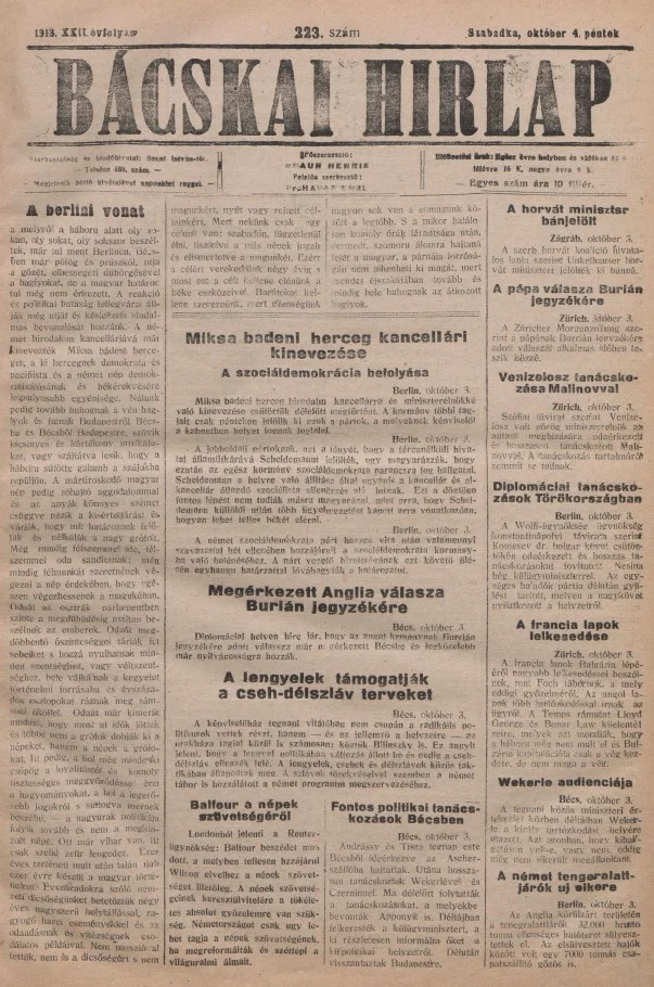 Bácskai Hirlap, 22. évf. 1918. október 4. 223. sz.