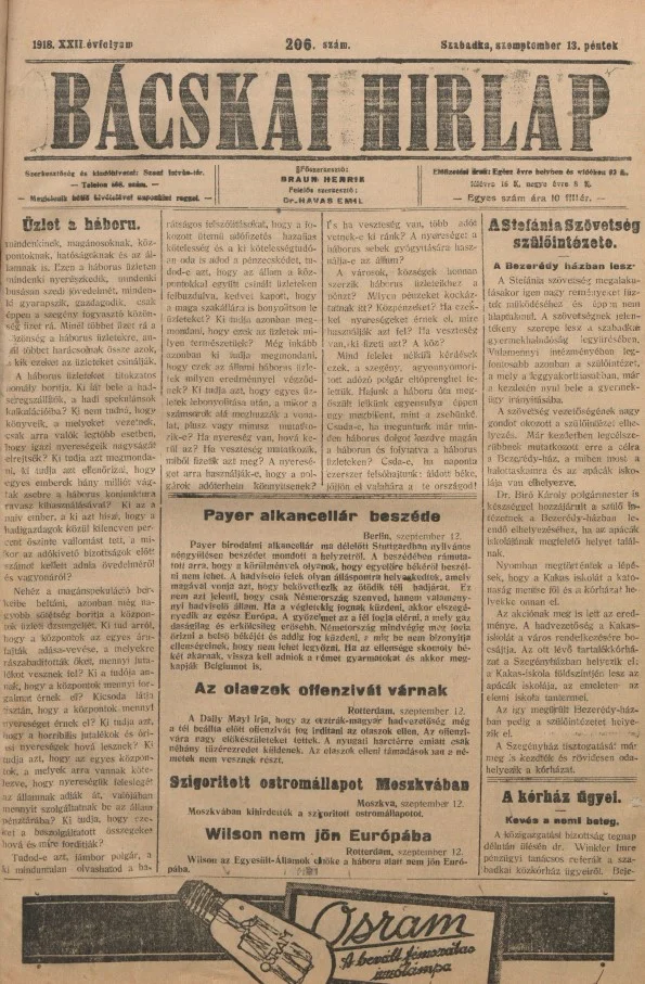Bácskai Hirlap, 22. évf. 1918. szeptember 13. 206. sz.