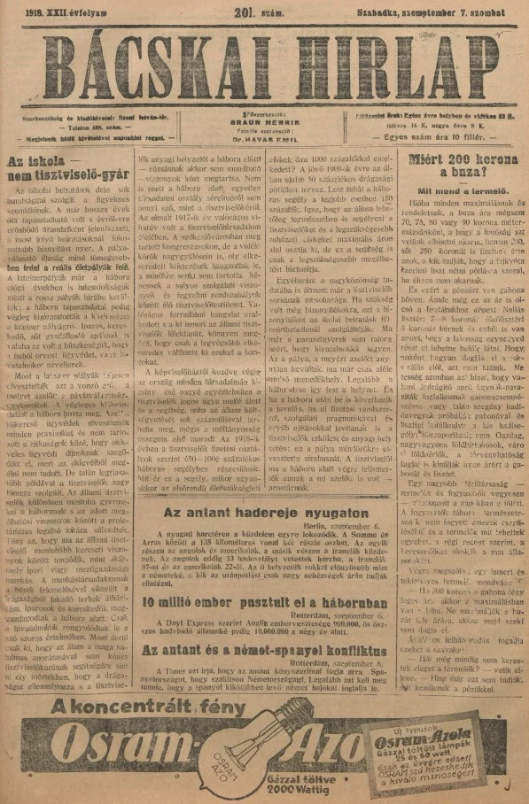Bácskai Hirlap, 22. évf. 1918. szeptember 7. 201. sz.
