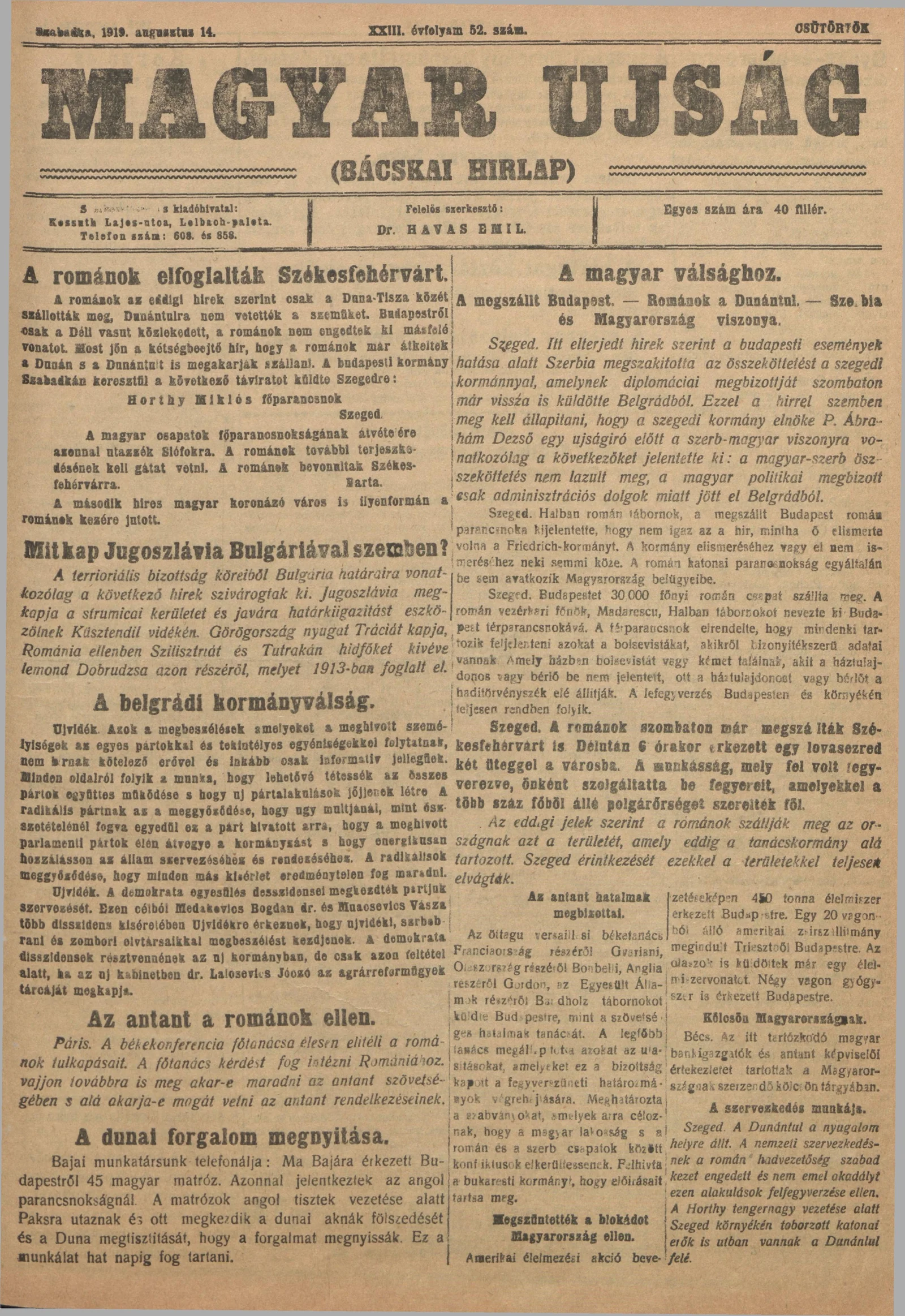 Bácskai Hirlap, 23. évf. 1919. augusztus 14. 52. sz.