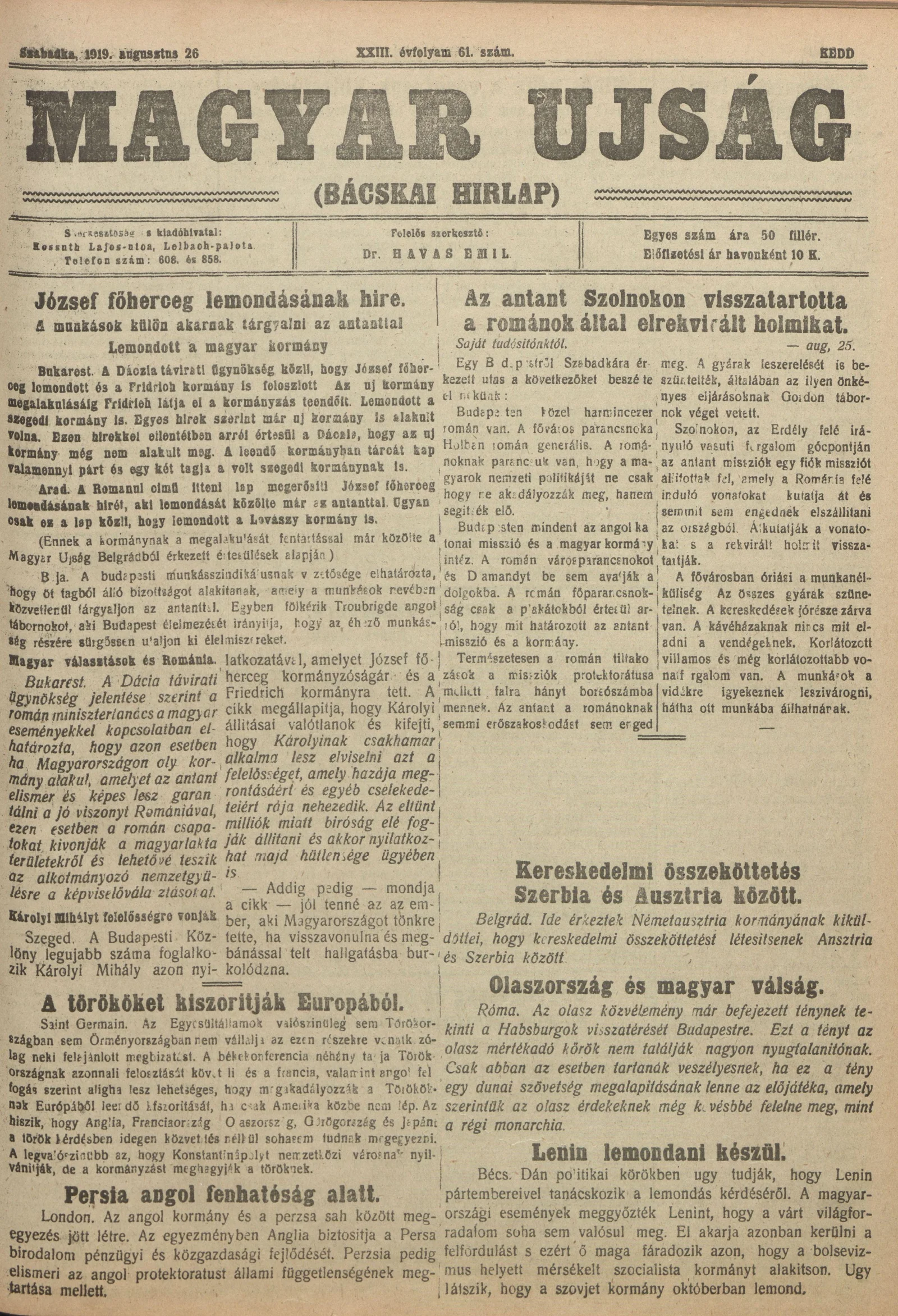 Bácskai Hirlap, 23. évf. 1919. augusztus 26. 61. sz.