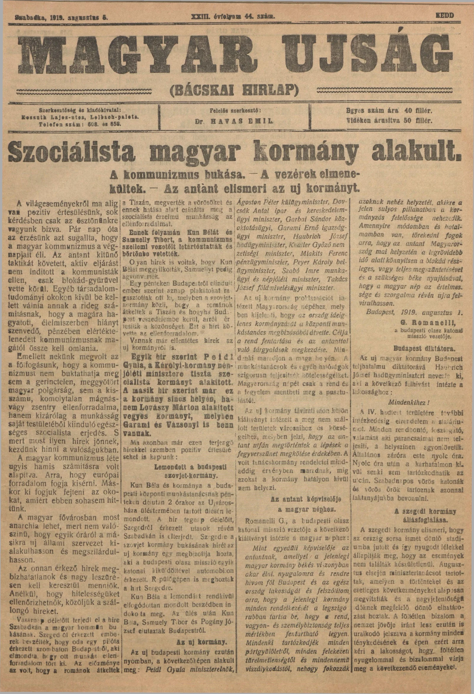 Bácskai Hirlap, 23. évf. 1919. augusztus 5. 44. sz.