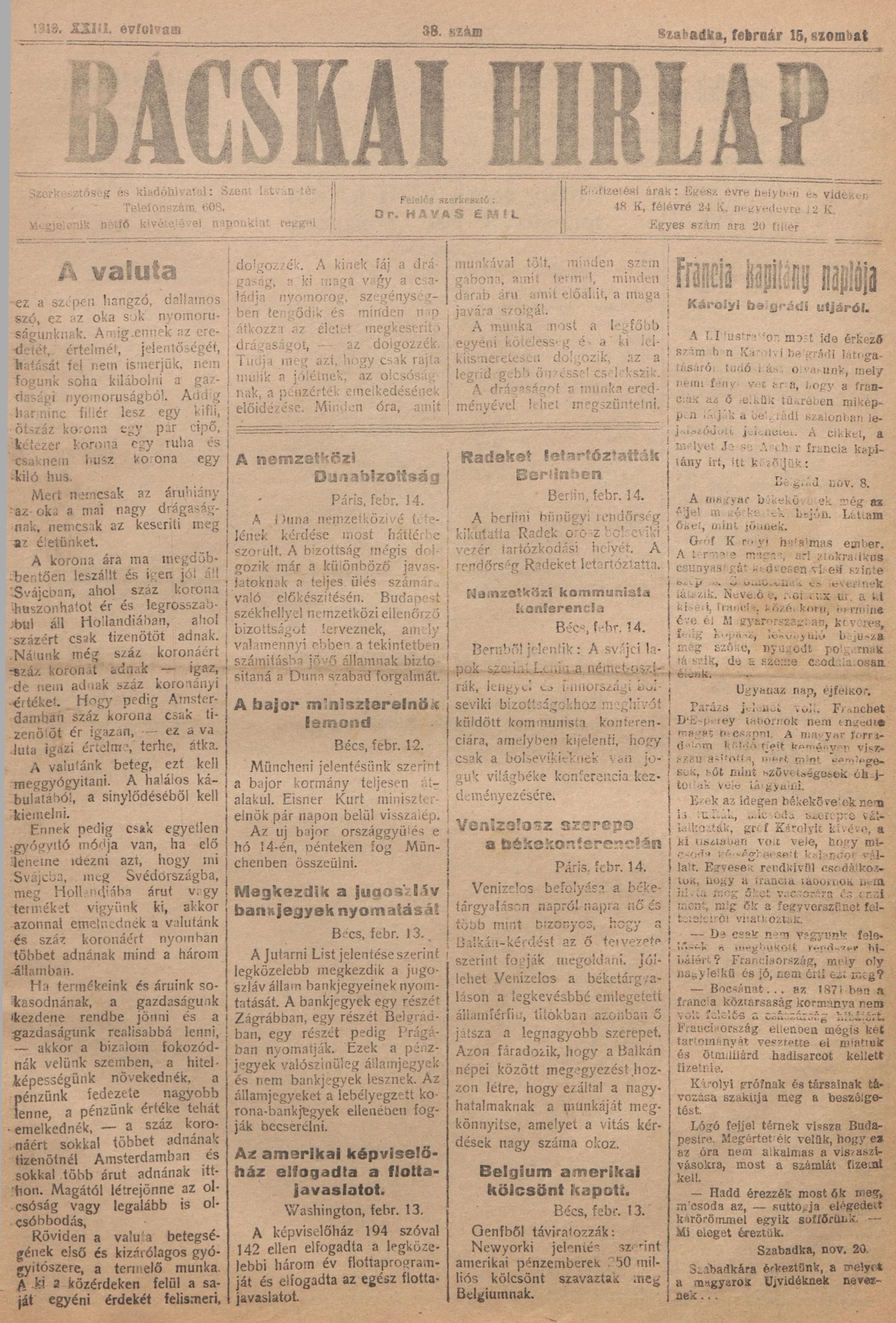 Bácskai Hirlap, 23. évf. 1919. február 15. 38. sz.