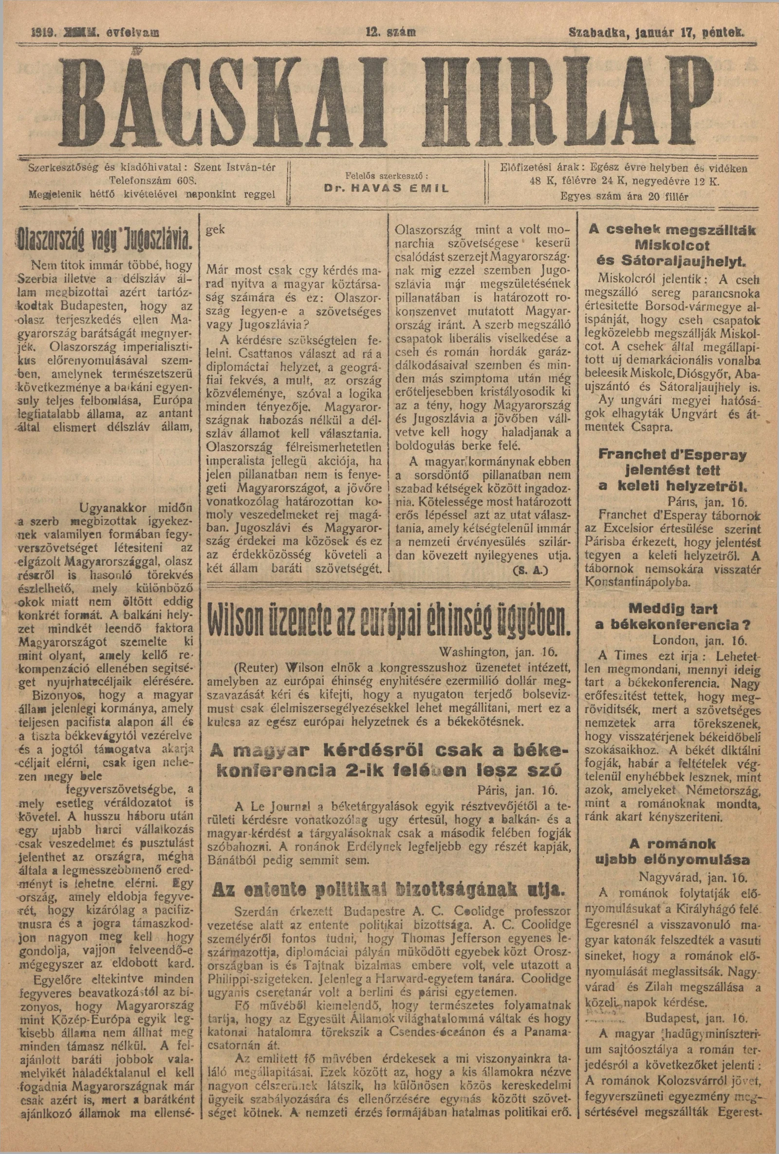 Bácskai Hirlap, 23. évf. 1919. január 17. 12. sz.