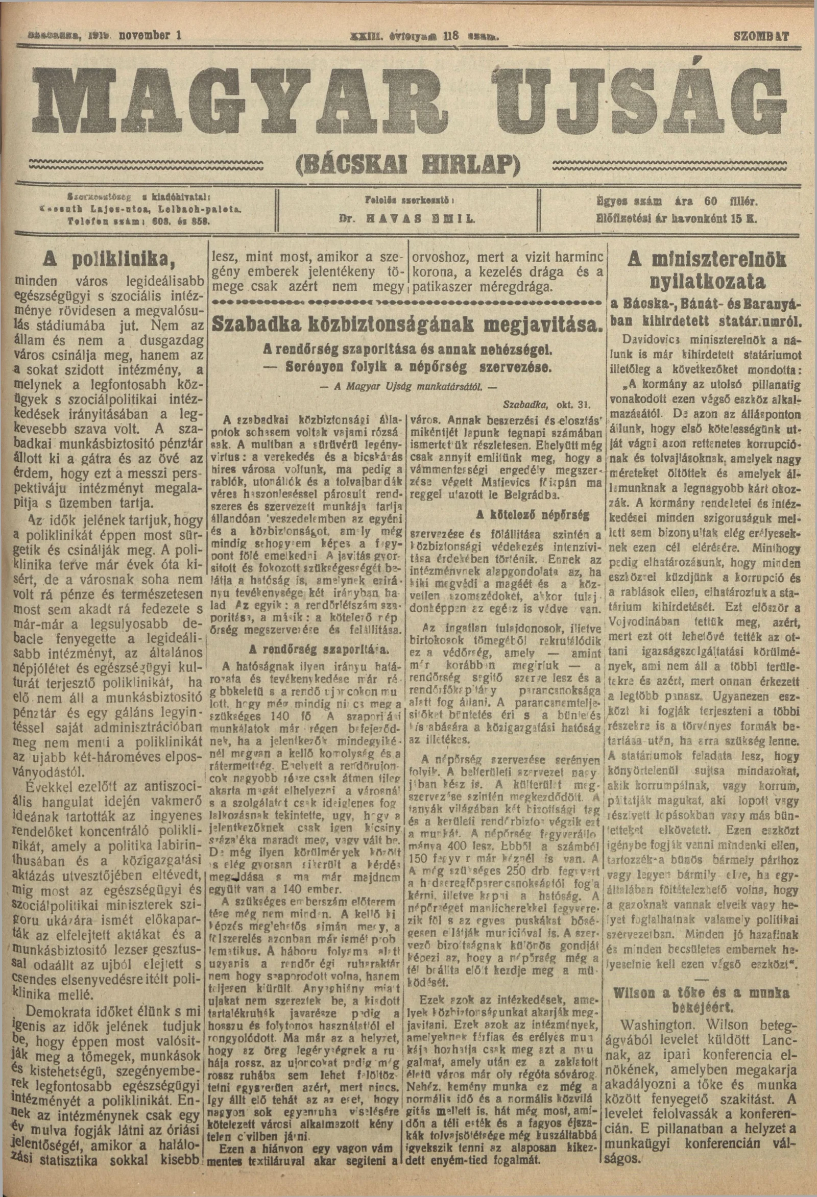 Bácskai Hirlap, 23. évf. 1919. november 1. 118. sz.