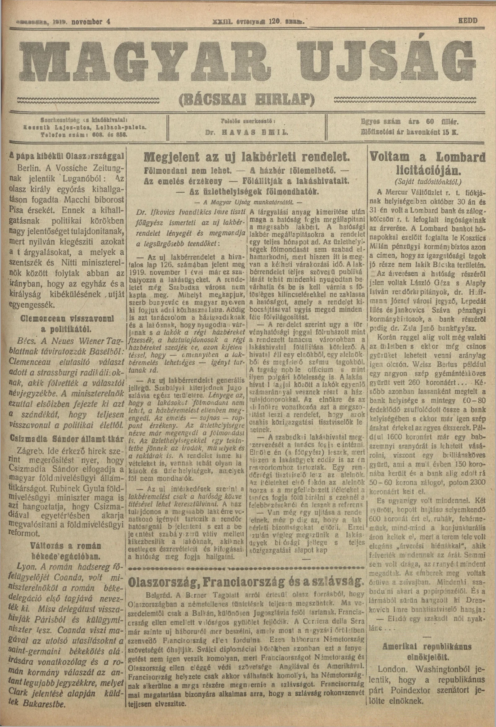 Bácskai Hirlap, 23. évf. 1919. november 4. 120. sz.