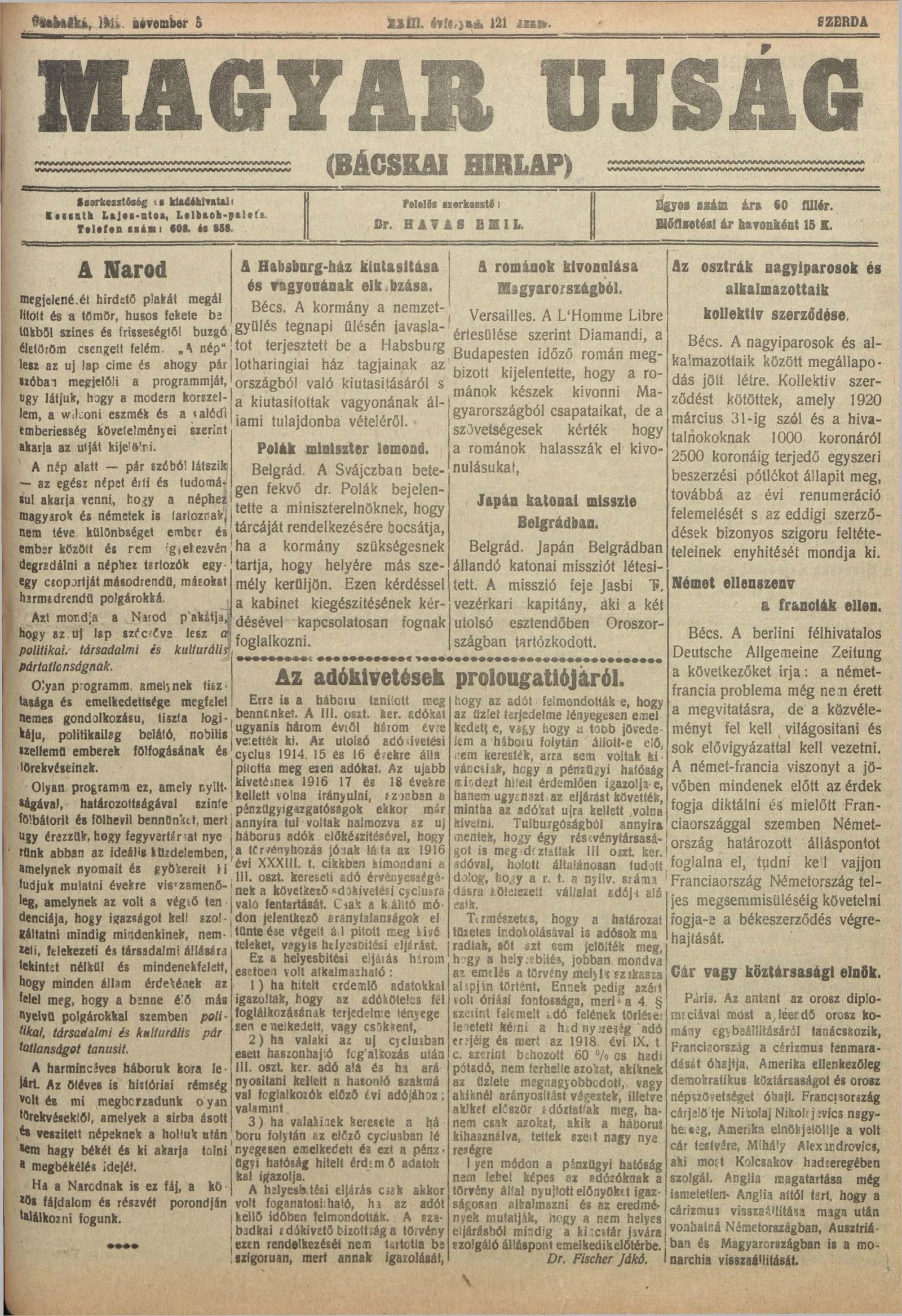 Bácskai Hirlap, 23. évf. 1919. november 5. 121. sz.