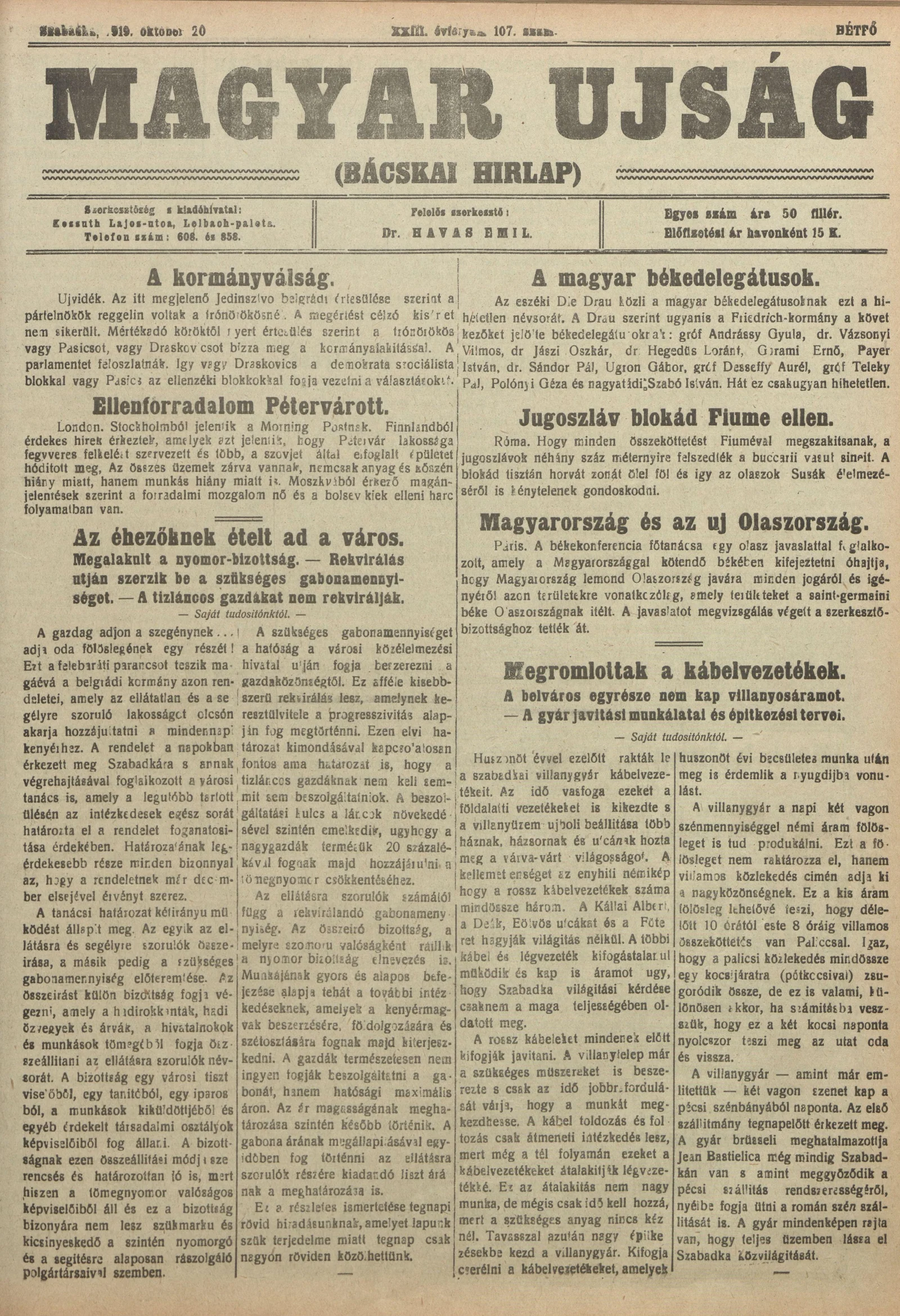 Bácskai Hirlap, 23. évf. 1919. október 20. 107. sz.