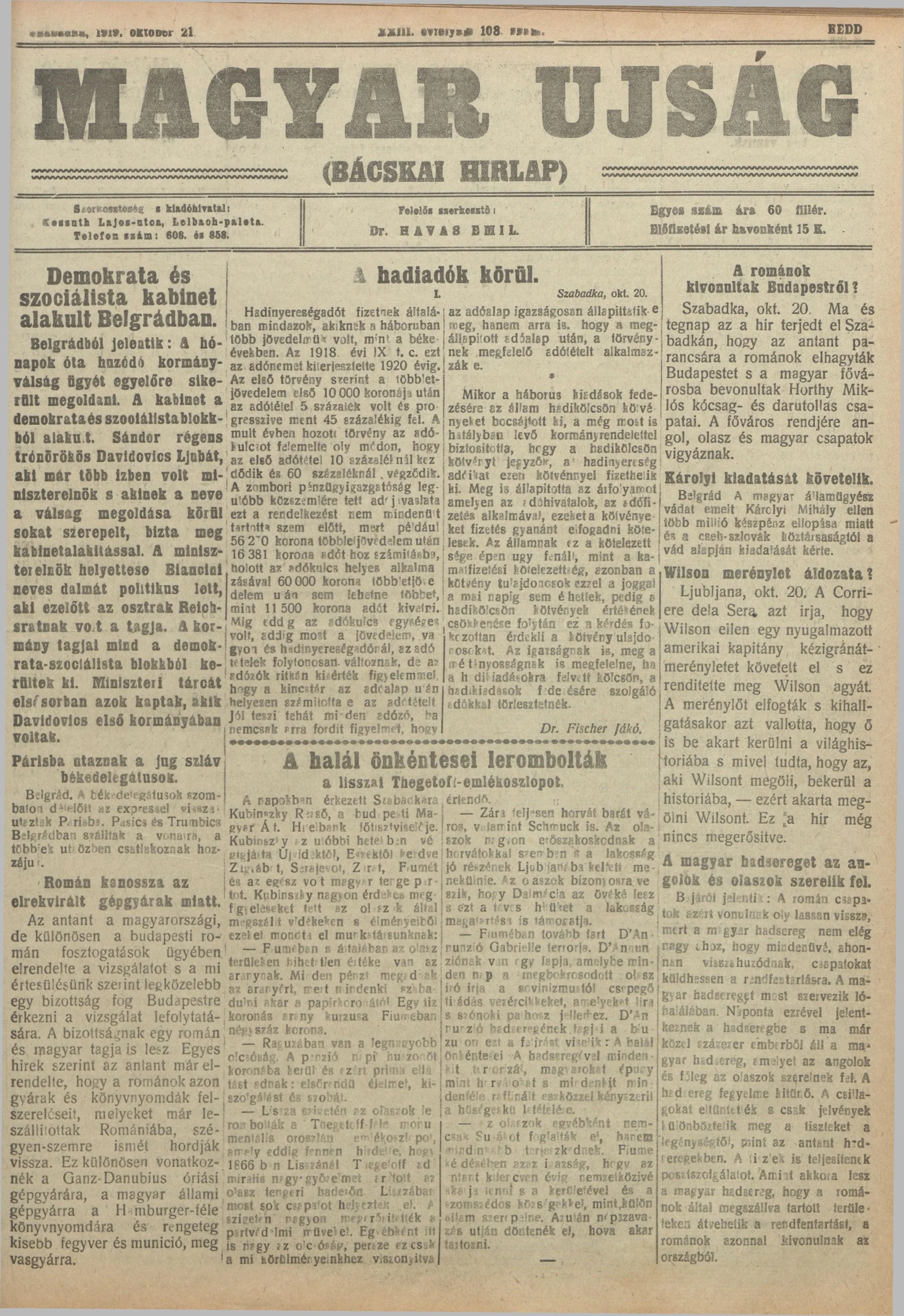 Bácskai Hirlap, 23. évf. 1919. október 21. 108. sz.