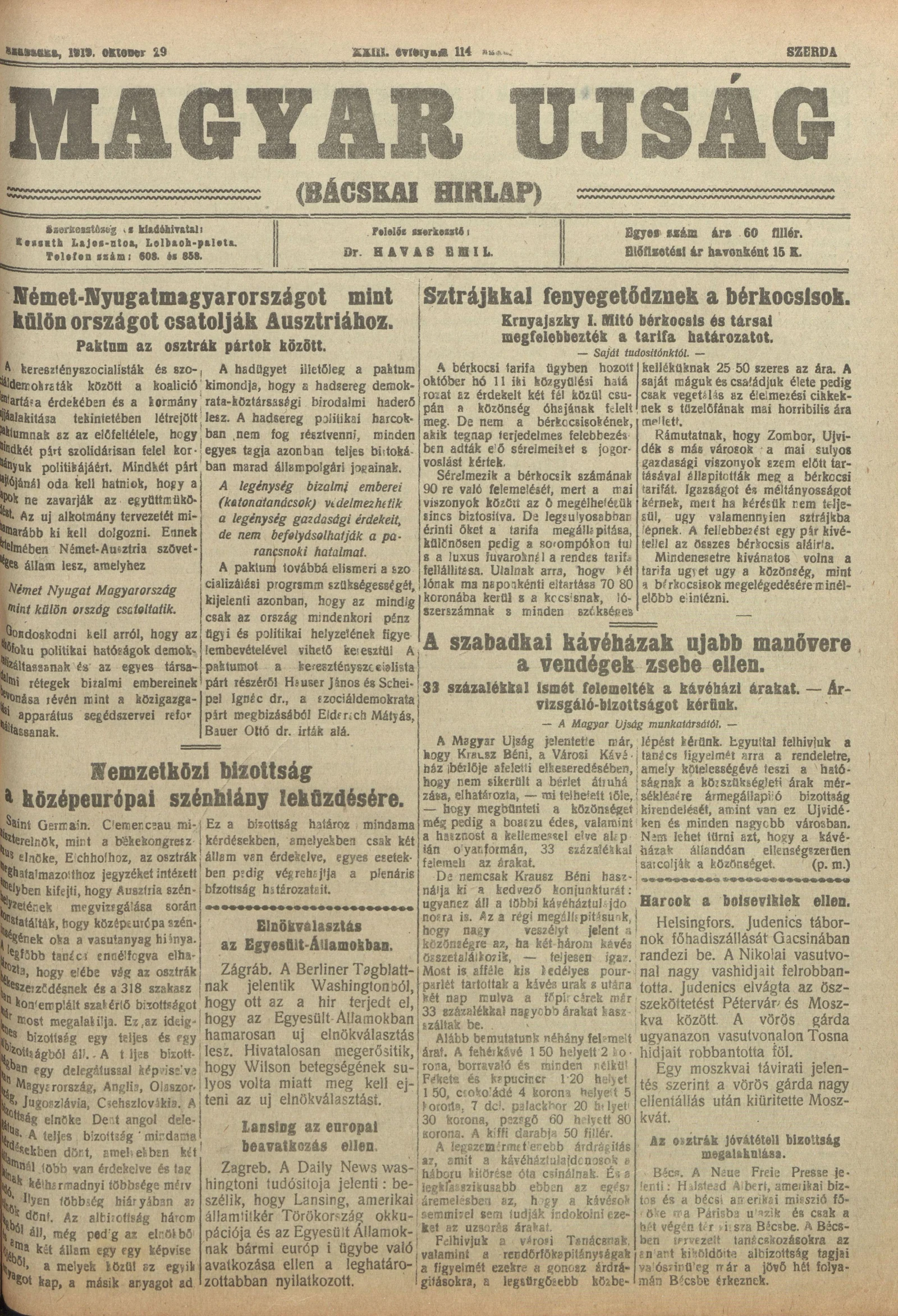 Bácskai Hirlap, 23. évf. 1919. október 29. 114. sz.