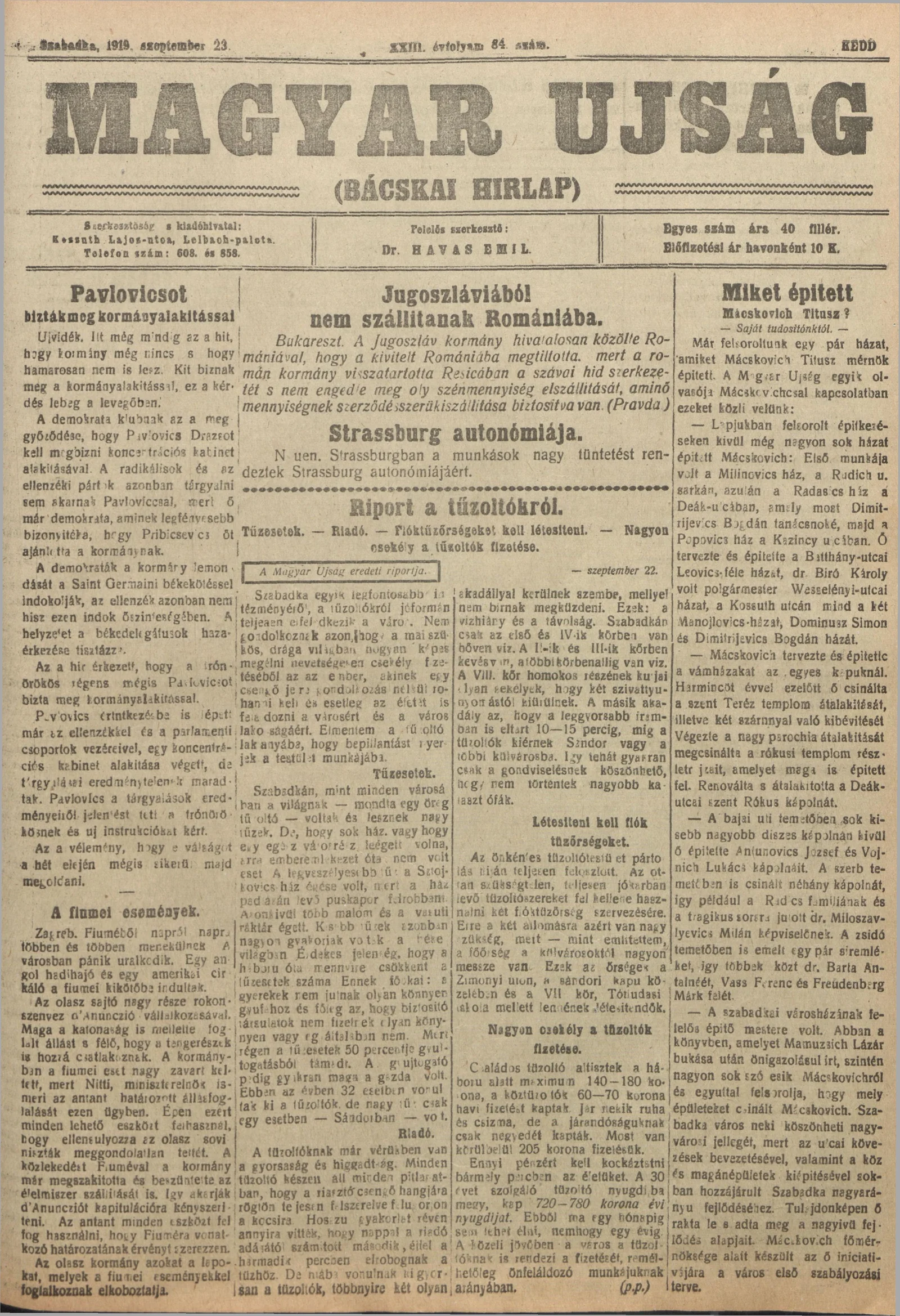 Bácskai Hirlap, 23. évf. 1919. szeptember 23. 84. sz.