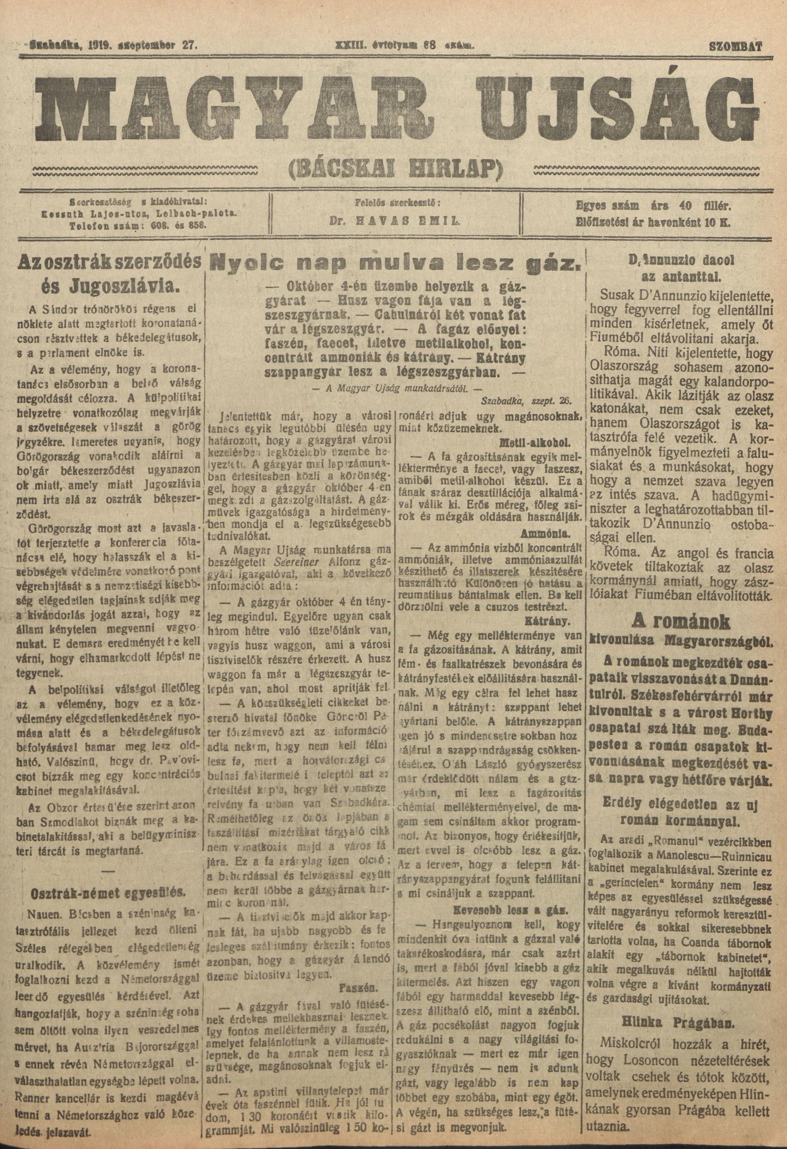 Bácskai Hirlap, 23. évf. 1919. szeptember 27. 88. sz.