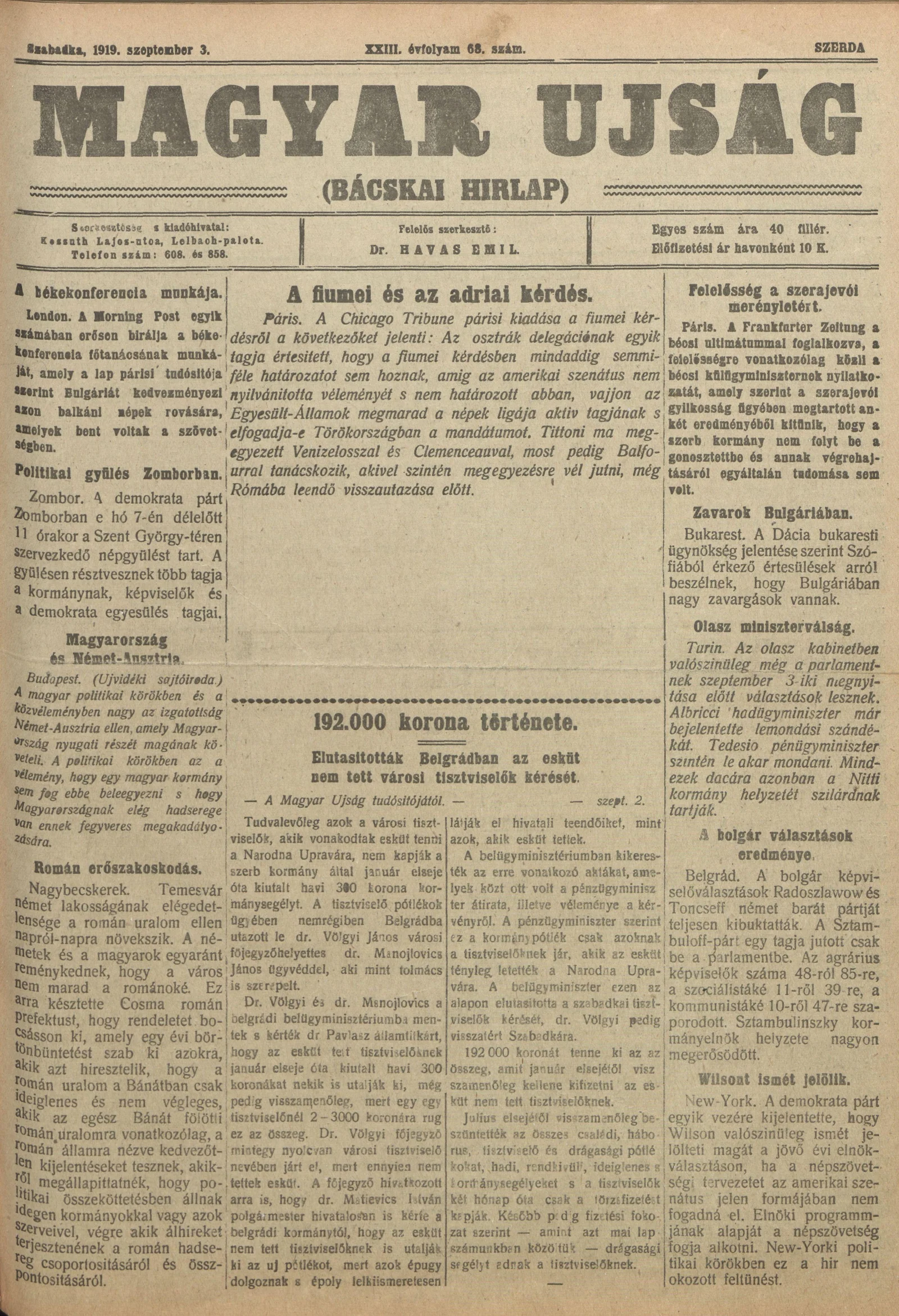 Bácskai Hirlap, 23. évf. 1919. szeptember 3. 68. sz.