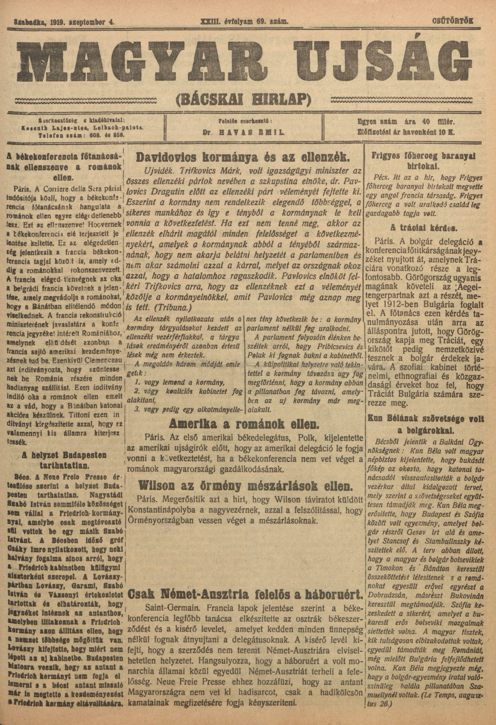 Bácskai Hirlap, 23. évf. 1919. szeptember 4. 69. sz.