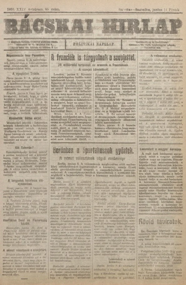 Bácskai Hirlap, 24. évf. 1920. június 11. 85. sz.