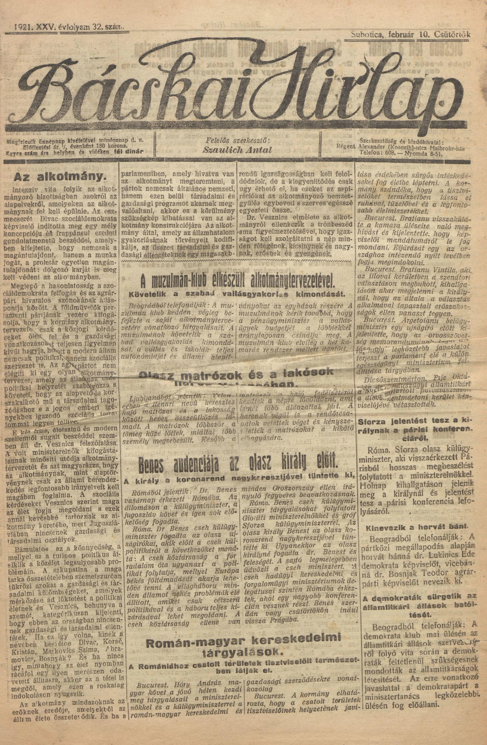 Bácskai Hirlap, 25. évf. 1921. február 10. 32. sz.