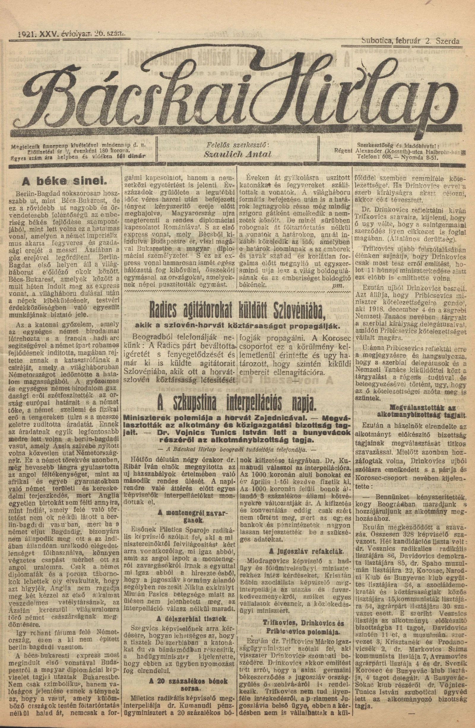 Bácskai Hirlap, 25. évf. 1921. február 2. 26. sz.