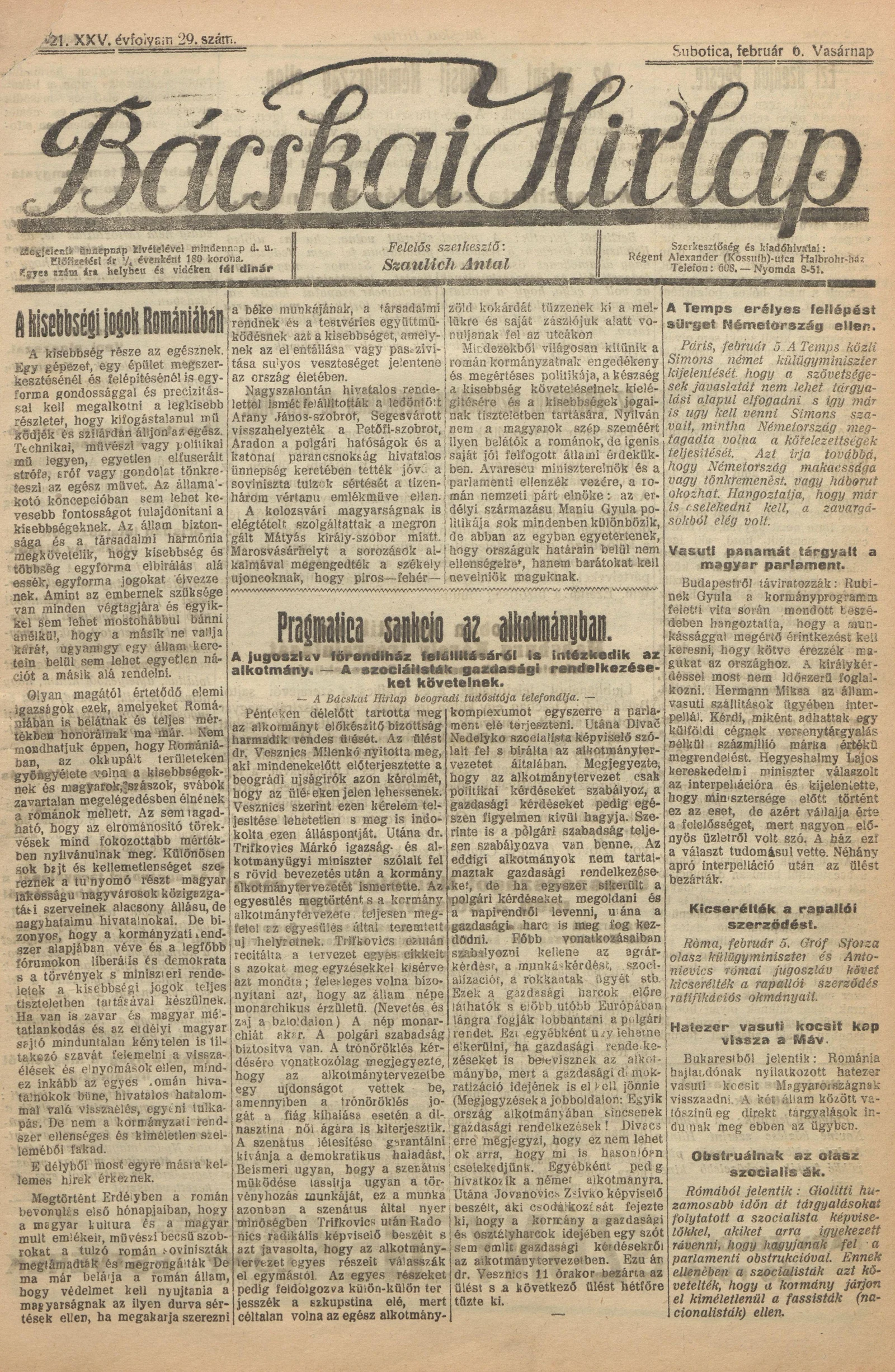 Bácskai Hirlap, 25. évf. 1921. február 6. 29. sz.