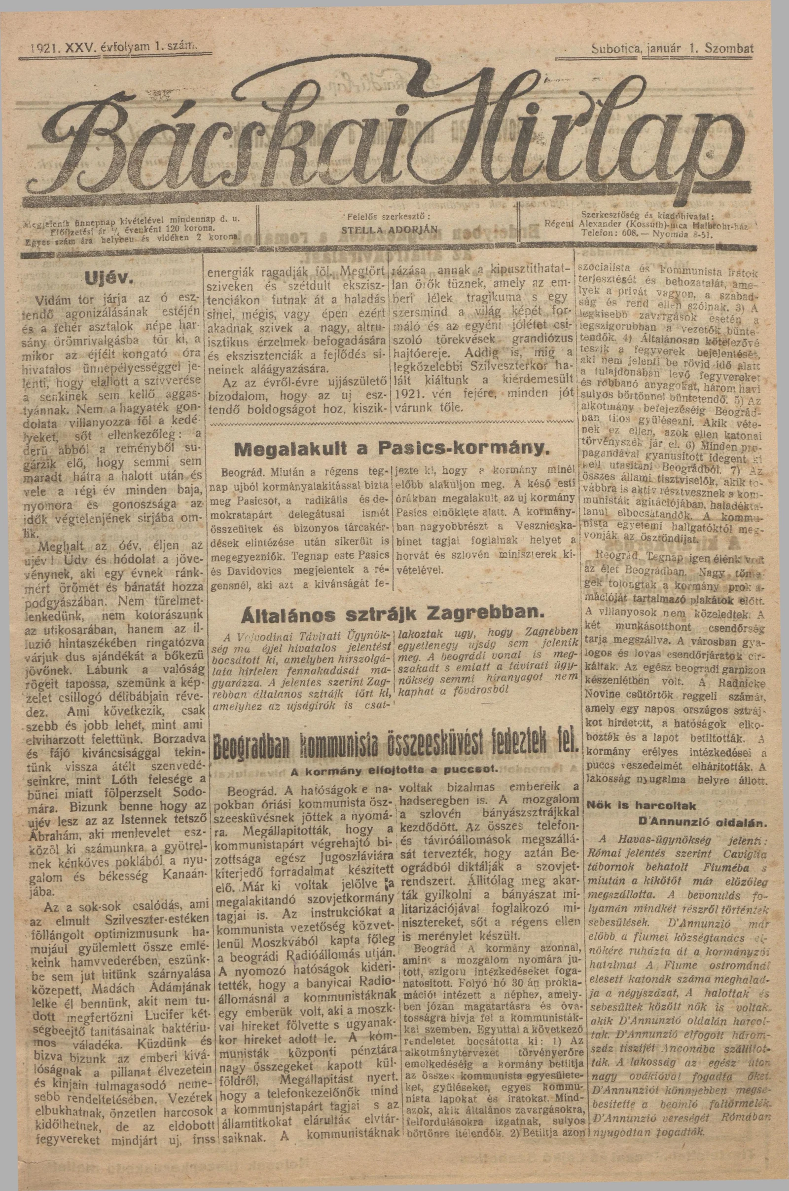 Bácskai Hirlap, 25. évf. 1921. január 1. 1. sz.